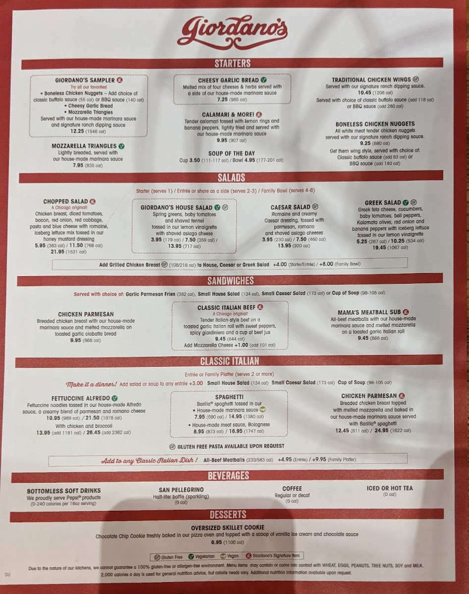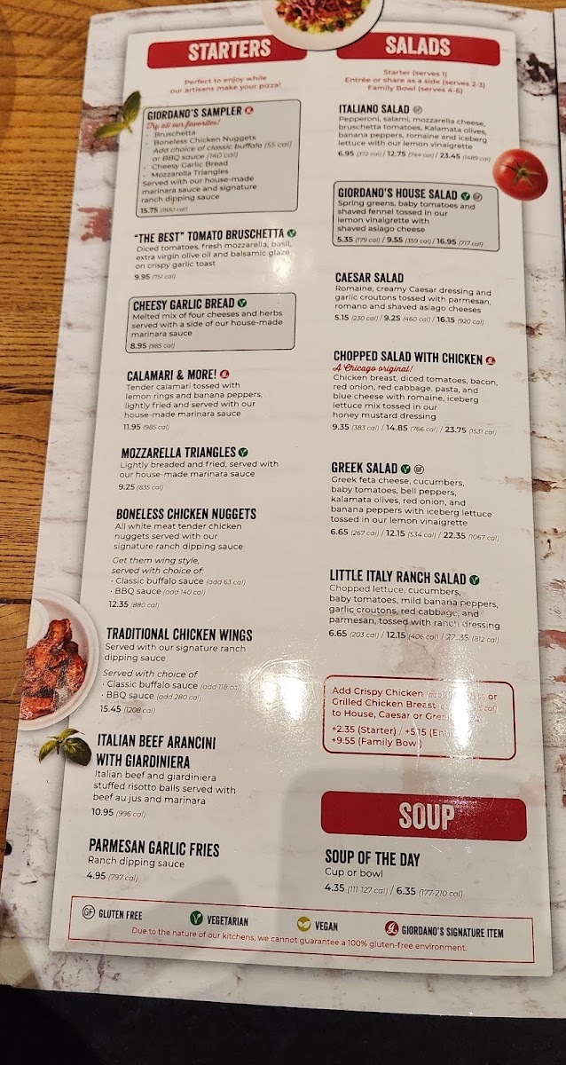 Giordano's is renowned for its exceptional deep-dish pizza, a hallmark of Chicago's culinary scene. The menu boasts a range of choices that will tantalize your taste buds. From the Extra Thin Crust Pizza, featuring a delectable Chicken Pesto topped with bruschetta tomatoes to the classic Margherita Pizza loaded with fresh mozzarella, every bite is an ode to Italian heritage. The option to Create Your Own pizza allows for personalization, ensuring that every guest can enjoy their perfect slice.